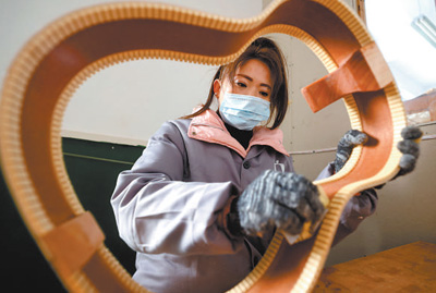 工作人员正在制作吉他。