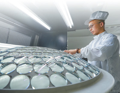 工作人员正在检查镜片质量。